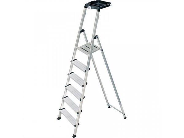 Praktikus és sokoldalú lépcsőfokos állólétra szinte korlátlan tárolási lehetőséggel, vödörtartóval és csúszásmentes dobogóval.